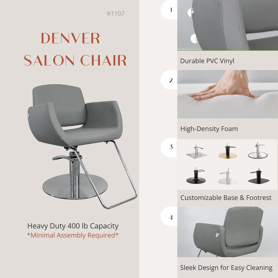 Saddle up into a comfortable cushion with the Denver Salon Chair! Your customer will be Rocky Mountain High with satisfaction after being taken care of in this sleek treat. When you choose the Denver Salon Chair, you choose a traditional and reliable hair styling chair meant to last through the ages.