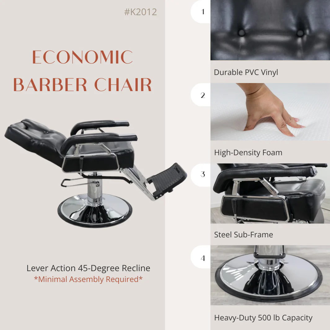 Invest in your business economically with a modern barber chair worth every penny. The Economic Barber Chair has reigned as one of our best sellers for over 20 years. So what makes this simple black barber chair a worthy investment? The Economic Barber Chair offers reliable, efficient, and durable characteristics all for an affordable price. With its heavy-duty steel frame and PVC vinyl upholstery, you can rest assured that this modern barber chair will last you through the years, saving you costs in the long and short term. Make the best economic investment for your business with the Economic Barber Chair.