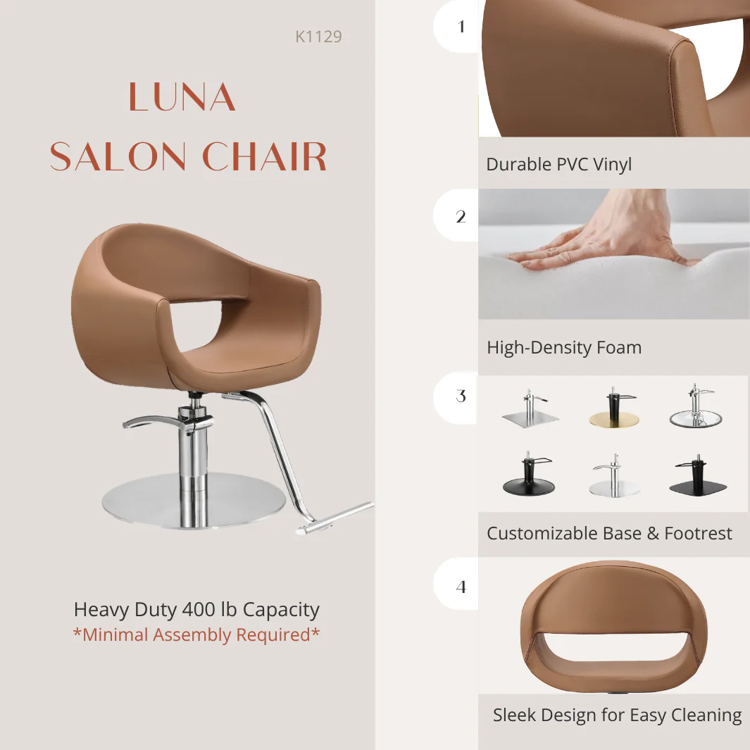 Round like the moon, the Luna Salon Chair displays an enchanting design that will turn heads. Perform that signature haircut of yours with the Luna Styling Chair today.