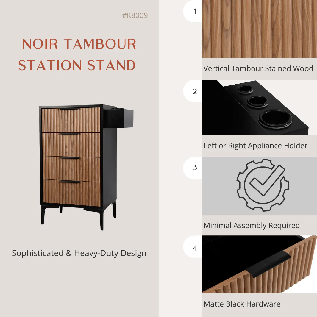 Bring a touch of sophistication to your shop - the warm walnut stain paired with matte black features is the perfect balance of form and function. This styling station has an interchangeable appliance holder so that it can be assembled on the left or right side - for a sleeker look, you can leave it off!