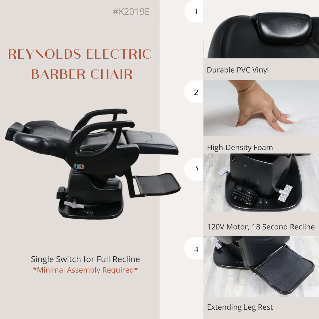 Sold exclusively with Keller International, the Reynolds Electric Barber Chair! Providing all the classic details needed to complete the perfect fade or trim, this new era barber chair model tops all the rest.
